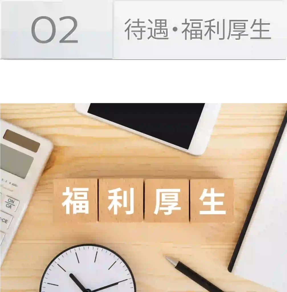 「スタッフの福利厚生を担当する専門セクションを設け、きめ細やかな対応を心掛けております。」有給休暇制度、各種社会保険制度(労働者災害補償保険・健康保険・厚生年金保険・雇用保険)、毎年の定期健康診断を完備、年末調整(常用勤務の方で、6ケ月の勤務を超えた場合)、月3回支払いOK、無料パソコン講座、無料ビジネスマナー講座そのほかにも専門のカウンセラーによる相談窓口なども設けております。