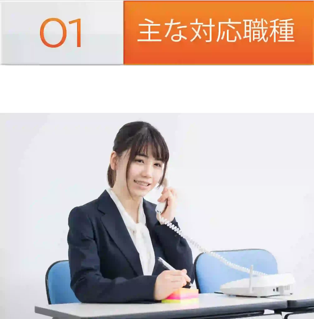 オフィスワーク系のお仕事(一般事務・営業事務・営業アシスタント・経理事務など)と販売・サービスのお仕事(アパレル販売・アクセサリー販売・その他イベント関連)を二大柱としてご紹介しております。また、単発・短期などの軽作業のお仕事(仕分け・封入・ピッキング)などもご紹介しております。